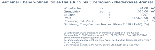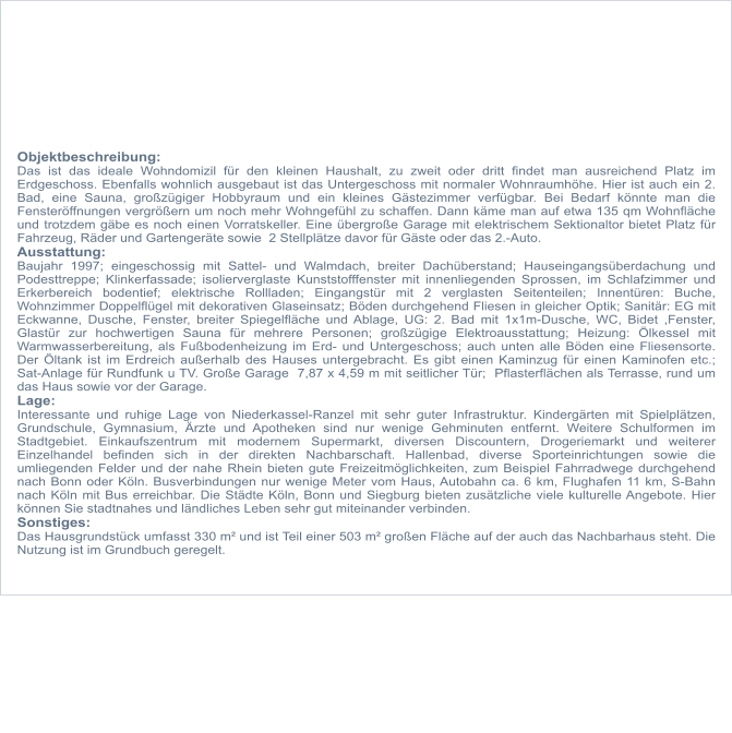 - Bildergalerie - Grundriss: Erdgeschoss Grundriss: Kellergeschoss Übersicht Erdgeschoss: Garage und Terrasse Diele Küche Küche Wohnen/Essen Wohnen/Essen Vorderansicht Immobilien Gerber - Rathausplatz 5 - 53859 Niederkassel - 02208.71701