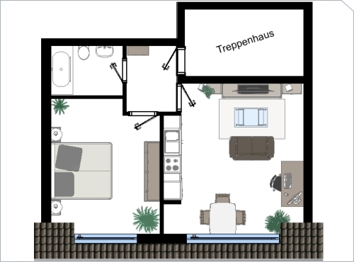 - Bildergalerie - Hausansicht Bad Diele/Bad Küchenzeile Wohnen mit Essplatz Wohnen Schlafen Küche Grundriss Immobilien Gerber - Rathausplatz 5 - 53859 Niederkassel - 02208.71701